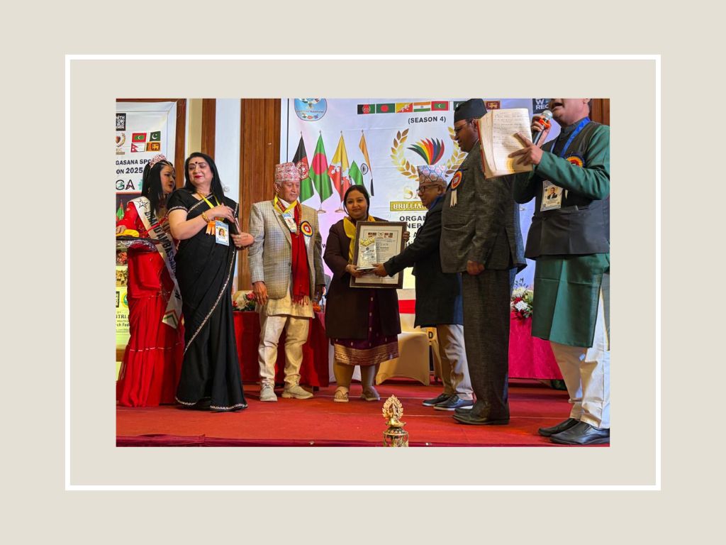 The prestigious summit was organized by the Bharat–Nepal Maitri Forum and witnessed the participation of eminent dignitaries and foreign delegates from various countries. In the august presence of Hon’ble Shri Madhav Kumar Nepal, former Prime Minister of Nepal, Advocate Shri Harendra Ray Yadav, Dr. Rajib Pal, and several international representatives, Advocate Mita Banerjee was formally felicitated for her outstanding contribution to society and diplomacy.